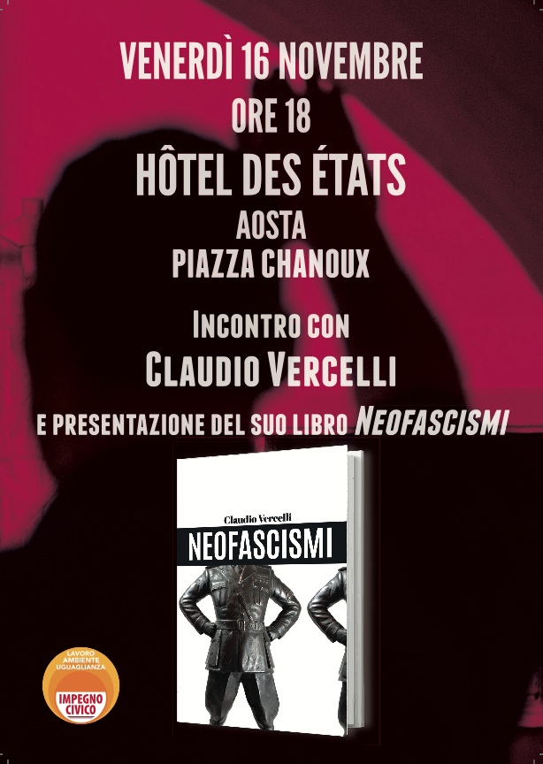 Venerdì 16 novembre, alle ore 18, nell'Hotel des États di Aosta, Claudio Vercelli presenta il libro Neofascismi.A dialogare con l'autore vi saranno dei rappresentati di Impegno civico, secondo i quali "Non si può più evitare di affrontare le preoccupanti involuzioni in atto nella società italiana, come in parte di quella europea, a partire dai numerosi episodi di aggressione e violenza…