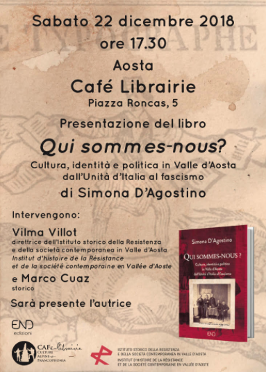 Sabato 22 dicembre, alle ore 17.30, nel Café Libraire di Aosta, Simona d'Agostino presenta Qui sommes-nous? Cultura, identità e politica in VdA dall'Unità al fascismo.Nel libro, l'autrice ripercorre un sessantennio cruciale - dall'Unità d'Italia al fascismo - della storia valdostana cercando di trovare una risposta a vari interrogativi.Il vomune è stato curato dall'Istituto storico della Resistenza e della società contemporanea…