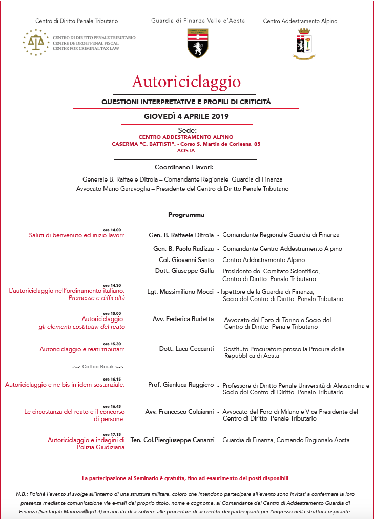 L’iniziativa intende approfondire le tematiche scaturenti della particolare fattispecie di reato. Con riferimento alle possibili interpretazioni del dettato normativo ed alle connesse criticità.Il seminario costituirà occasione di confronto e riflessione su tematiche di stretta attualità coinvolgendo, oltre che gli appartenenti al Corpo, gli Ordini Professionali (avvocati e dottori commercialisti) e, in generale tutti gli operatori del settore, con l'attribuzione, per…