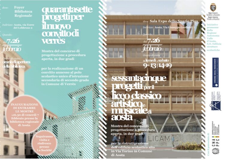 Venerdì 7 febbraio alle 16.30 è stata inaugurata un’esposizione dedicata ai progetti elaborati per due nuove sedi scolastiche regionali. La mostra presenterà i 65 progetti partecipanti al concorso per la realizzazione dell’edificio destinato a ospitare il Liceo artistico e il Liceo musicale di Aosta, in via Torino, e i 47 elaborati per la costruzione del nuovo convitto di Verrès, annesso…