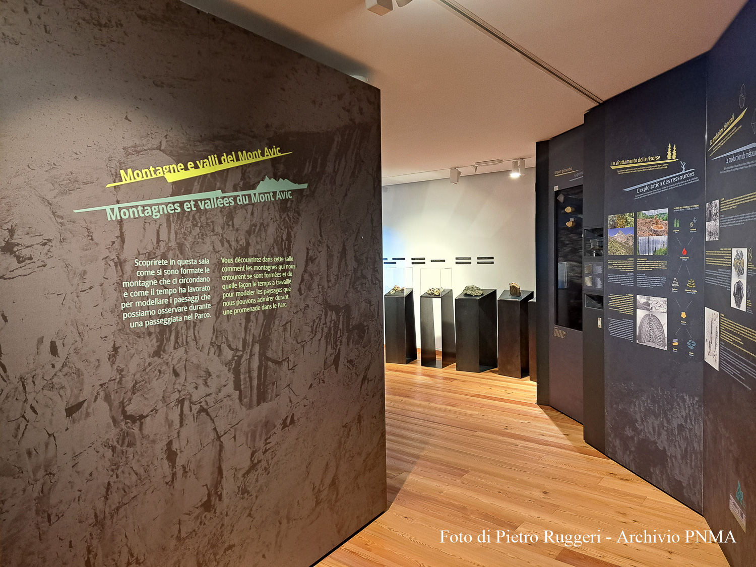 Nel Centro visita si potrà accedere alla parte espositiva, in cui si trova la descrizione degli aspetti geologici, morfologici e biologici degli ambienti di alta quota del Parco, tra cui le caratteristiche geologiche e morfologiche del vallone di Dondena, e ammirare una ricca serie di immagini fotografiche, reperti, modelli dinamici e un plastico su cui vengono proiettate carte tematiche.
