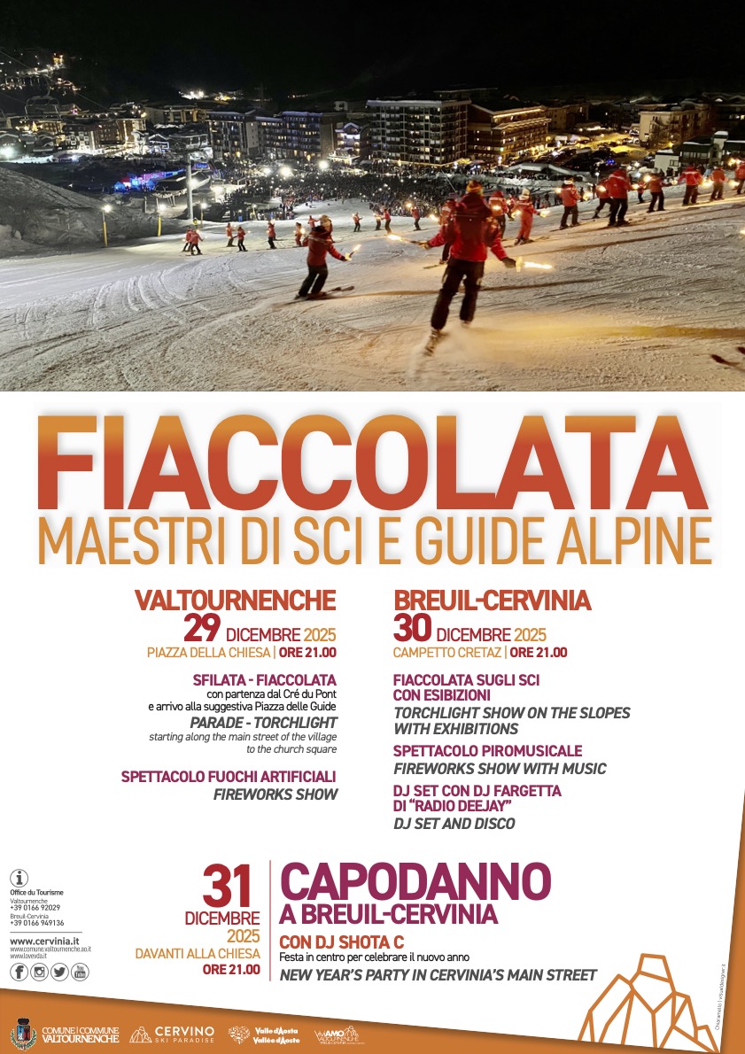 Il Capodanno ai piedi del Cervino si aprirà lunedì 29 e martedì 30 dicembre altri due momenti di grande fascino e tradizione, con le fiaccolate dei maestri di sci e delle guide alpine. Il primo giorno l’evento si svolgerà a Valtournenche, il secondo replica a Breuil-Cervinia (campetto Crétaz). L’inizio degli spettacoli è previsto per le 21.