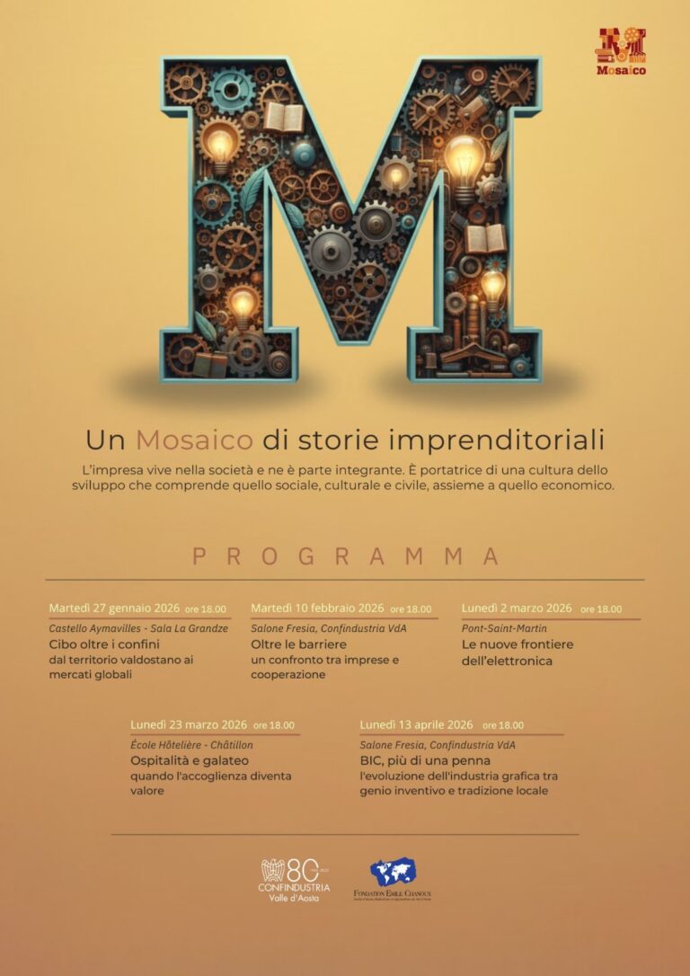 Mercoledì 7 gennaio 2026, ConfIndustria Valle d'Aosta ha presentato la quarta edizione della rassegna Mosaico: cinque appuntamenti tra il 27 gennaio e il 13 aprile, organizzati insieme alla Fondation Chanoux. Il primo evento è previsto per martedì 27 gennaio alle ore 18, nella sala La Grandze del castello di Aymavilles sul tema Cibo oltre i confini: dal territorio valdostano ai…