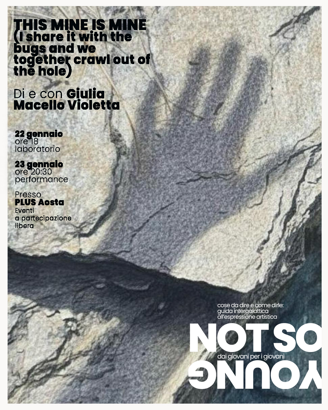 Si passa poi al nuovo anno col workshop di arti multimediali a cura di Giulia Macello Violetta, artista visiva specializzata in pratiche sitespecific, nata e residente ad Aosta e diplomata presso l’Università Iuav di Venezia, che lavorerà con gli studenti della Saint Roch da martedì 20 a venerdì 23 gennaio 2026, con workshop a partecipazione libera giovedì 22 gennaio alle ore 18 e performance aperta a tutti che porta il titolo This mine is mine I share it with the bugs and we together crawl out of the hole, venerdì 23 gennaio ore 20.30, sempre al Plus.