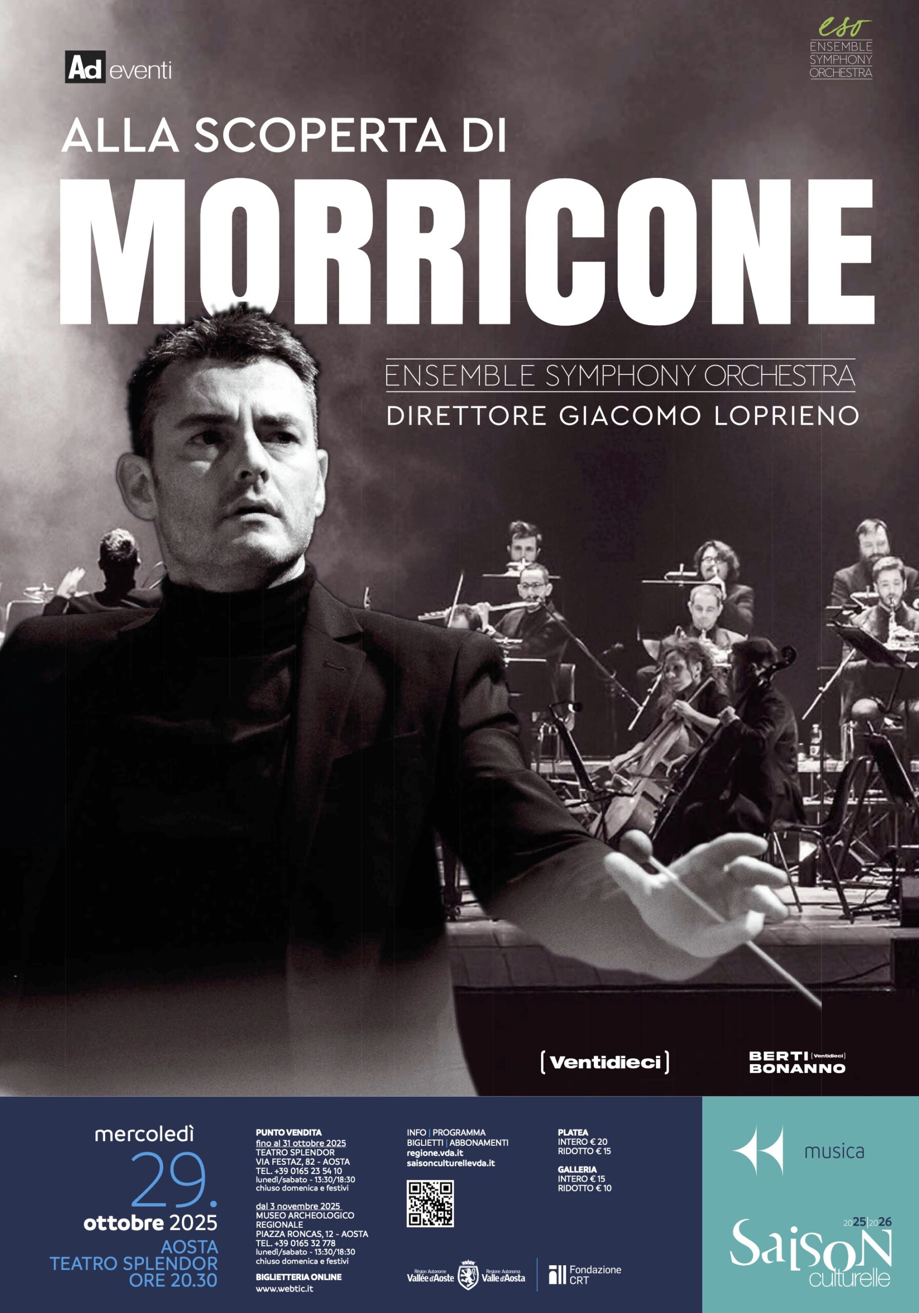 Non solo un concerto, ma un percorso di parole, suggestioni e performance solistiche che guidano lo spettatore attraverso i decenni che hanno reso grande il cinema e la musica italiana e internazionale Il viaggio incredibile iniziato tra le melodie che sono rimaste nella memoria collettiva di generazioni con la potenza evocativa di Mission, La Leggenda del Pianista sull’Oceano, C’era una volta il West, Nuovo Cinema Paradiso, The Hateful Eight, C’era una volta in America, Per qualche dollaro in più, Malena e che ha caratterizzato l’attività dell’Ensemble Symphony Orchestra nelle scorse stagioni, prosegue affrontando altre opere come Gli Intoccabili, La Califfa, Canone inverso, con uno spazio importante per le grandi canzoni scritte per artiste come Dulce Pontes, Joan Baez e Mina in una nuova versione sinfonica.