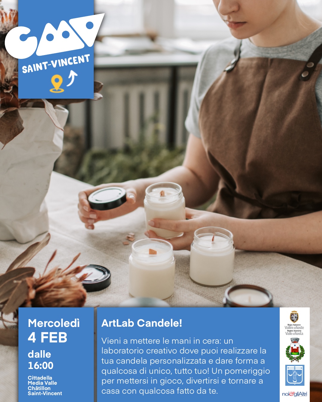 Il percorso inizia mercoledì 4 febbraio a Saint-Vincent con l’ArtLab dedicato alla creazione di candele in cera. In questo laboratorio pomeridiano, che inizierà alle ore 16, i partecipanti avranno l’occasione di mettere letteralmente le mani in pasta per realizzare un oggetto personalizzato e unico da portare a casa, sperimentando il piacere della manualità.