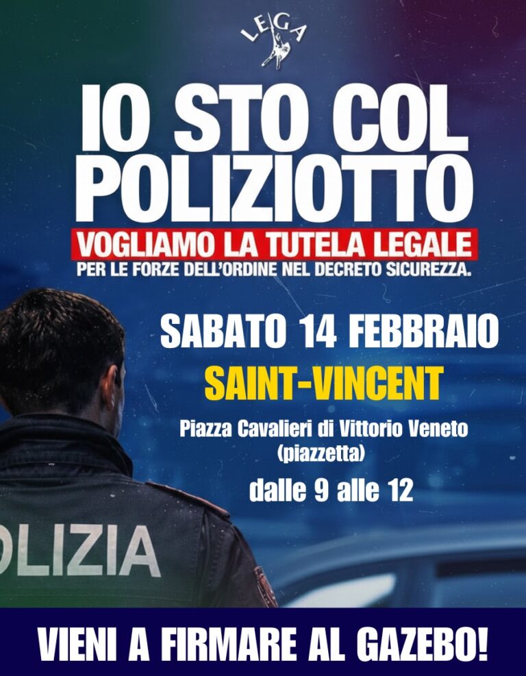 La Lega Vallée d’Aoste annuncia due appuntamenti sul territorio dedicati al confronto con i cittadini sui temi della sicurezza e dell’attualità politica nazionale e locale, accompagnati da una raccolta firme e da momenti di dialogo diretto con la popolazione. Le iniziative sono previste sabato 14 febbraio 2026 a Saint-Vincent in Piazza Cavalieri di Vittorio Veneto dalle ore 9.30 alle 12.30…