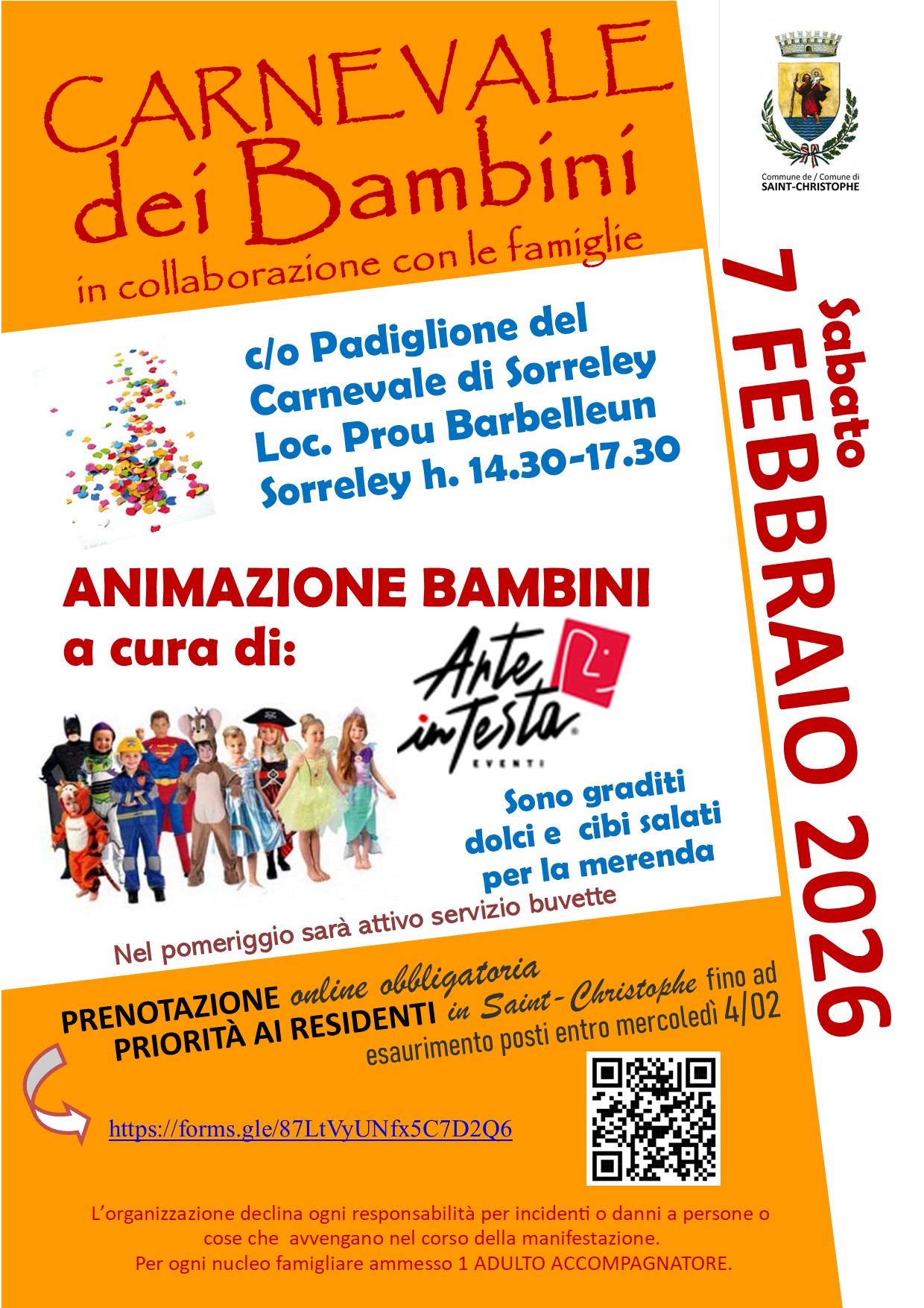 Sabato 7 febbraio 2026 dalle ore 14.30 alle ore 17.30, nel padiglione del Carnevale a Sorreley in loc. Prou Barbelle, si accoglieranno tutti i bambini per l’atteso Carnevale dei Bambini. Per ragioni organizzative per partecipare all’evento è necessario compilare il form di iscrizione tramite link https://forms.gle/87LtVyUNfx5C7D2Q6 o qr code in locandina allegata.
