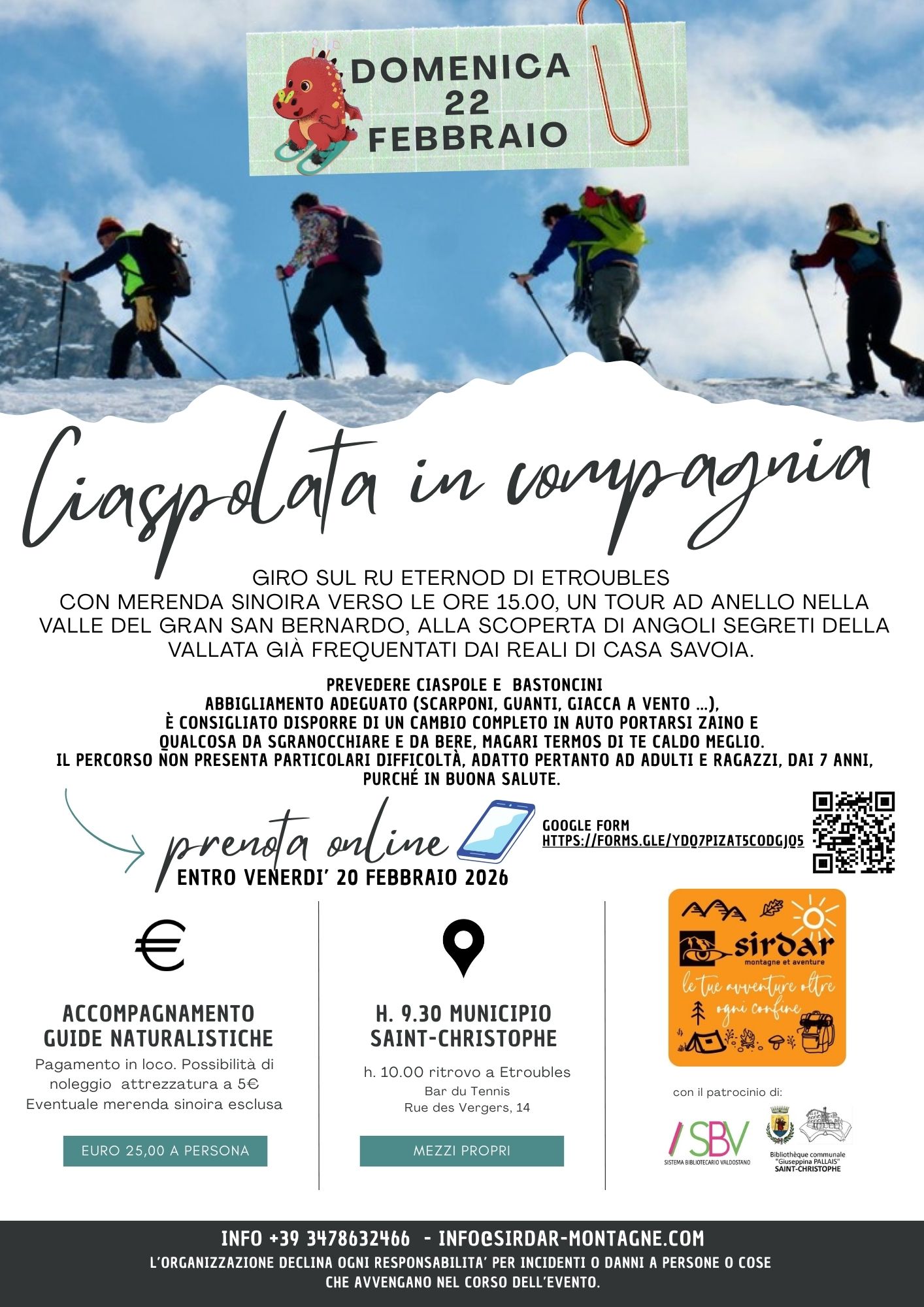 In collaborazione con Sirdar Montagne domenica 22 febbraio 2026 è proposta la Ciaspolata in compagnia giro sul Ru Eternod di Etroubles, con merenda sinoira verso le ore 15, un tour ad anello nella valle del Gran San Bernardo, alla scoperta di angoli segreti della vallata già frequentati dai reali di casa Savoia. Il ritrovo è alle ore 9.30 presso il Municipio di Saint-Christophe.