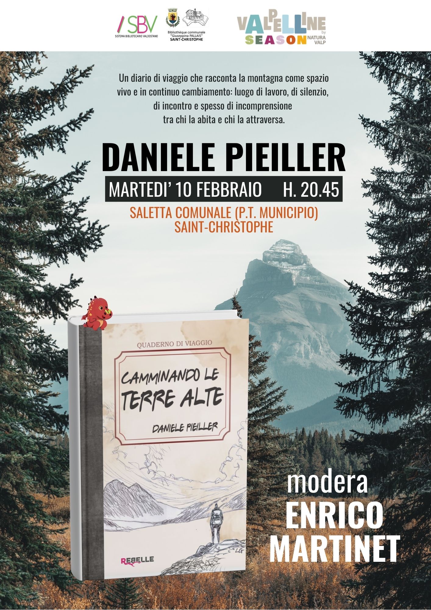 Martedì 10 febbraio 2026 alle ore 20.45, nella saletta comunale del Municipio sarà presentato il libro Camminando le terre alte di Daniele Pieiller, un diario di viaggio che racconta la montagna come spazio vivo e in continuo cambiamento: luogo di lavoro, di silenzio, di incontro e spesso di incomprensione tra chi la abita e chi la attraversa. Modera Enrico Martinet.