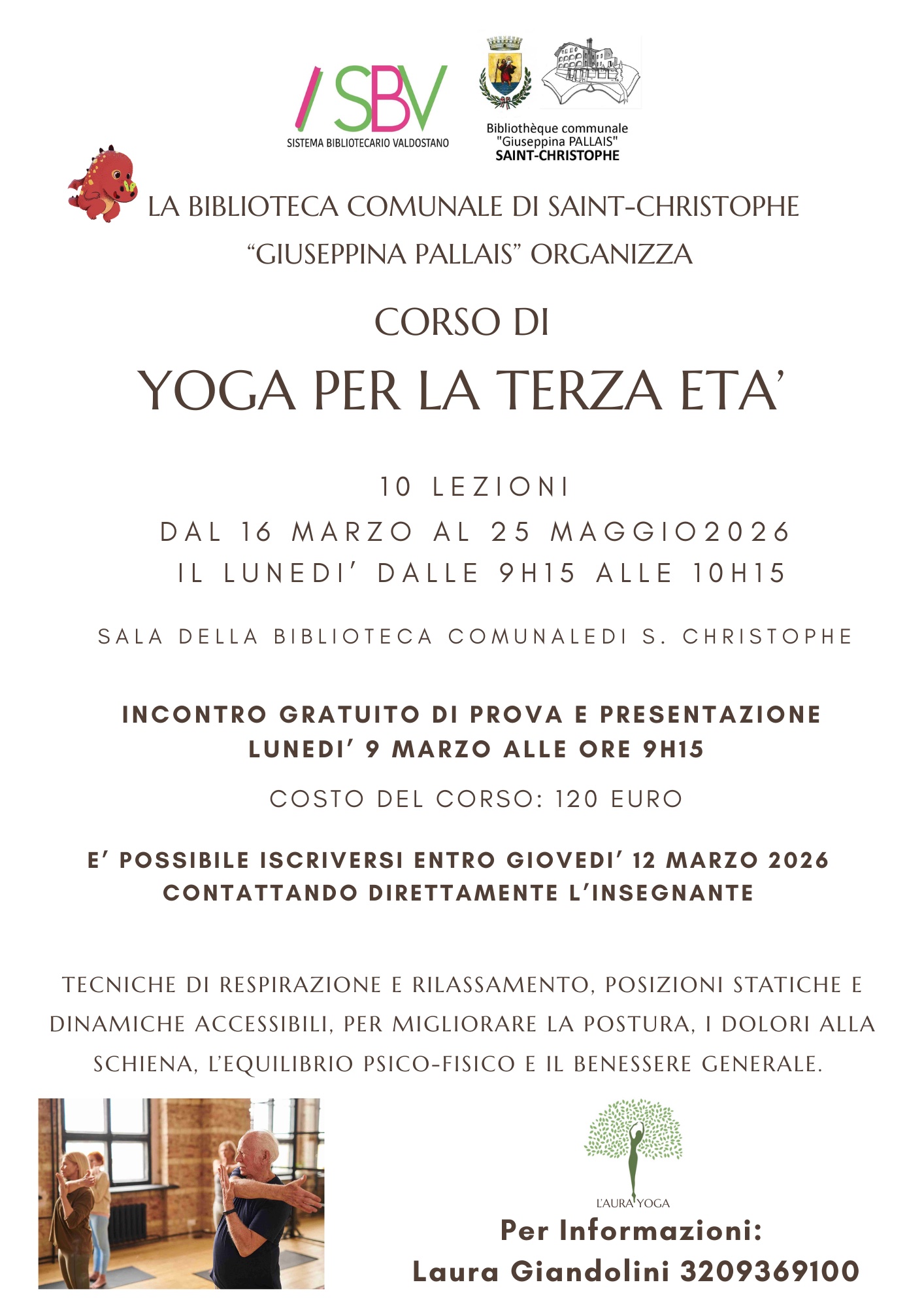 Lunedì 9 marzo 2026 alle ore 9.15, nella saletta comunale situata al piano terra del Municipio di Saint-Christophe, si svolgerà una lezione di prova gratuita di yoga dedicata alla terza età. Questa iniziativa introduce un percorso strutturato che si svilupperà successivamente dal 16 marzo al 25 maggio 2026, con appuntamenti fissi ogni lunedì mattina della durata di un’ora.