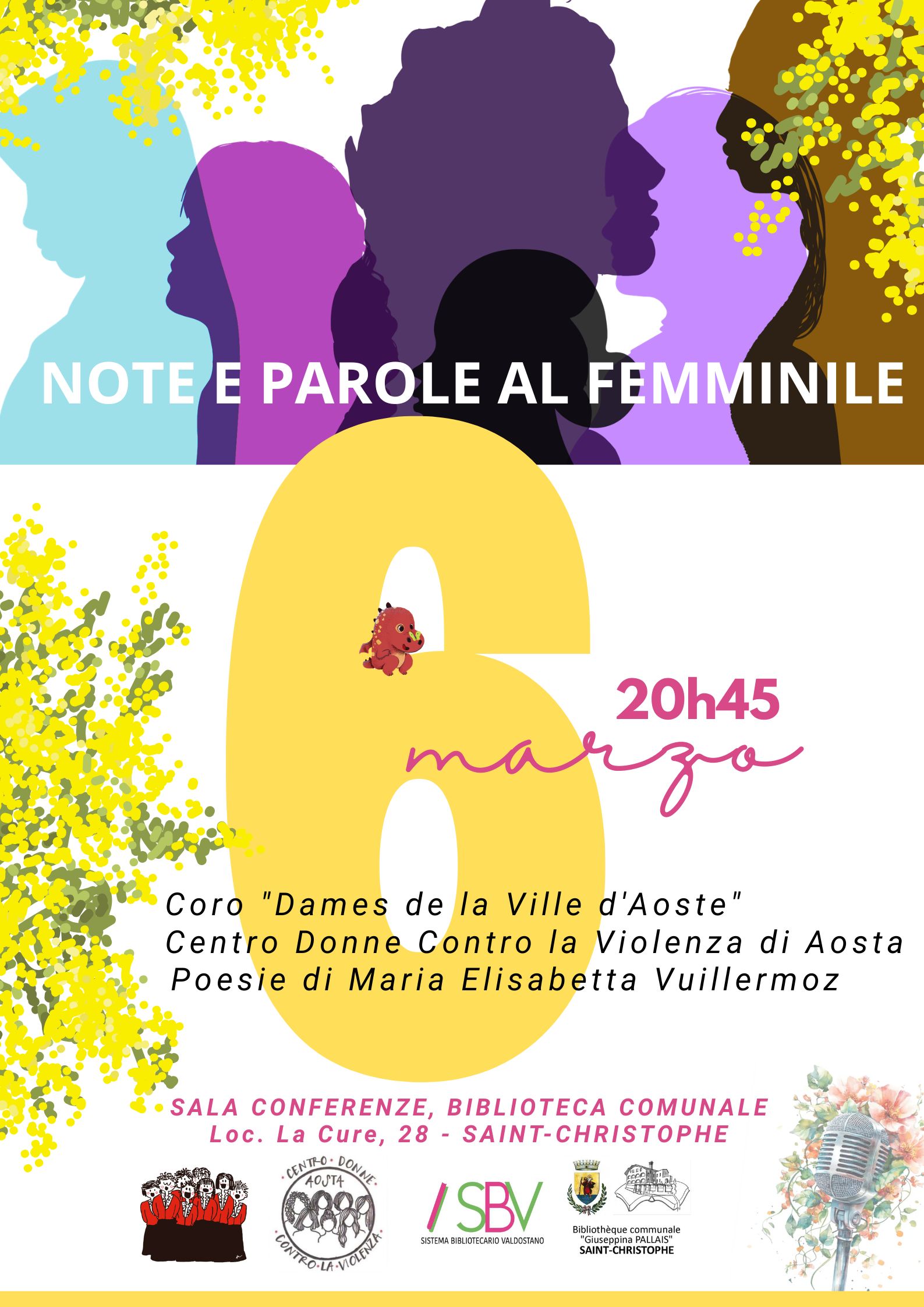 Venerdì 6 marzo alle ore 20.45, nella sala conferenze si svolgerà Note e parole al femminile, interverrà Maria Elisabetta Vuillermoz, il Coro Les Dames de la Ville d’Aoste e il Centro Donne contro la Violenza di Aosta.
