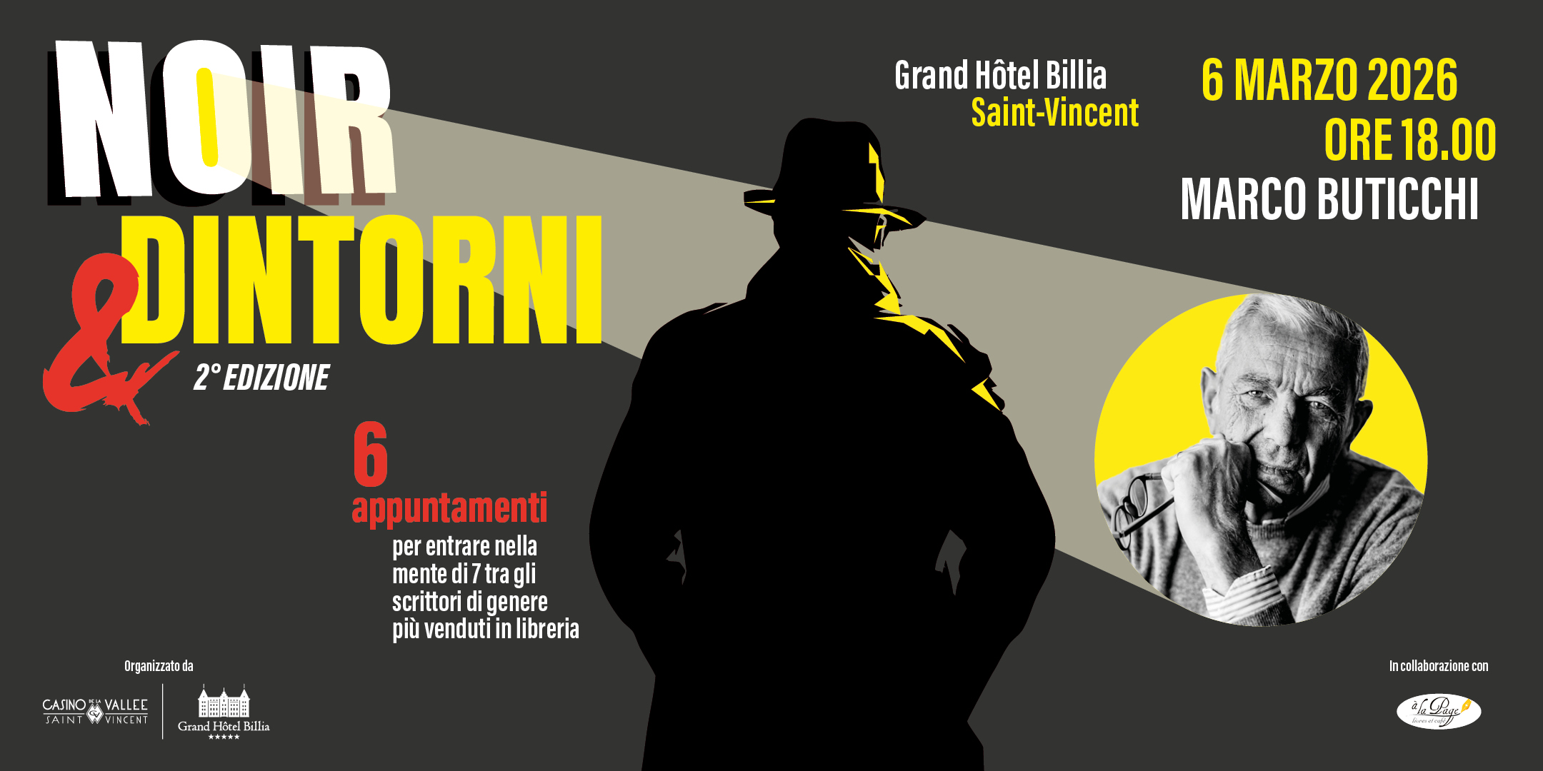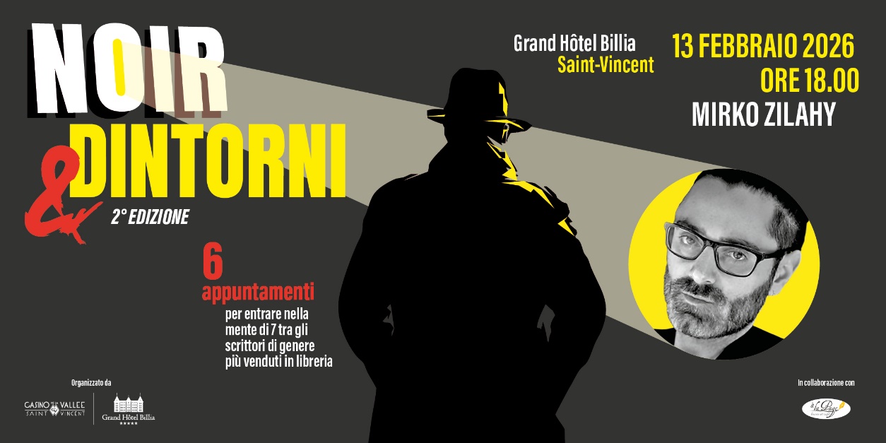 Venerdì 16 gennaio 2026 inizia la seconda edizione della rassegna Noir&Dintorni, un ciclo di sei appuntamenti dedicati alla narrativa di genere che si svolgerà al Grand Hôtel Billia di Saint-Vincent, in collaborazione con la libreria A La Page di Aosta.