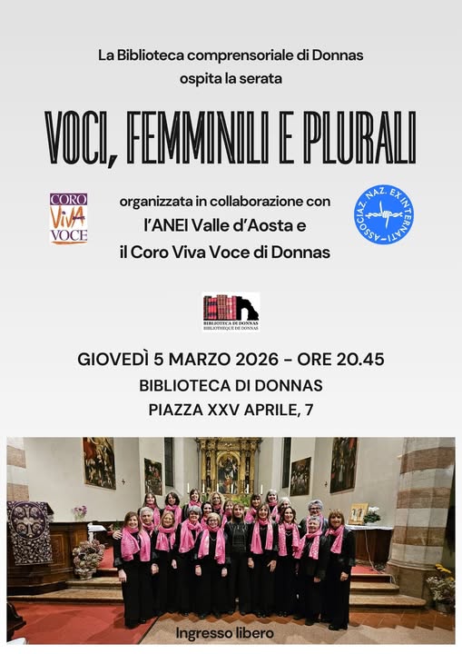 Nei locali della Biblioteca comprensoriale di Donnas, giovedì 5 marzo alle ore 20.45 si svolgerà una serata dedicata alla coralità e alla memoria. La serata, intitolata Voci, femminili e plurali, è organizzata in collaborazione con l’Anei Valle d’Aosta e il Coro viva voce di Donnas.