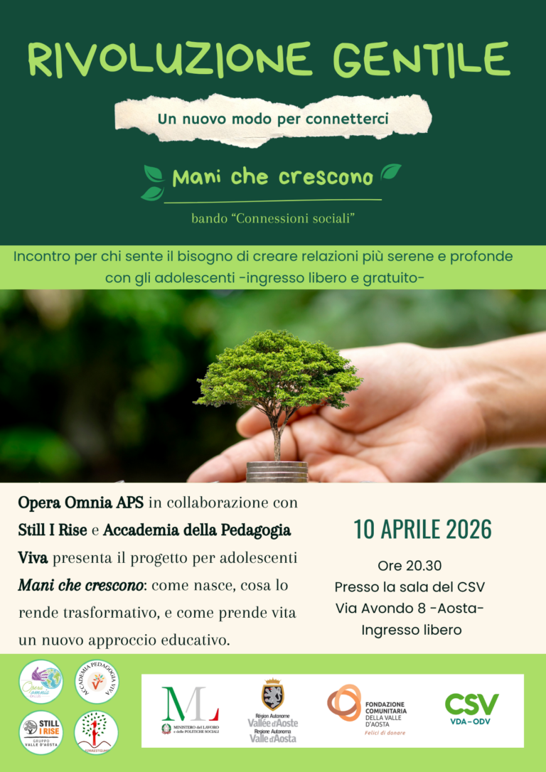 Giovedì 10 aprile 2026, alle ore 20.30, la sala del CSV ad Aosta ospita Rivoluzione Gentile – Mani che crescono, incontro promosso nell'ambito del bando connessioni sociali. L'ingresso è libero e gratuito fino a esaurimento dei posti disponibili. L'evento presenterà il progetto educativo Mani che crescono, approfondendone le origini, il valore trasformativo e le prospettive di sviluppo, attraverso un dialogo…