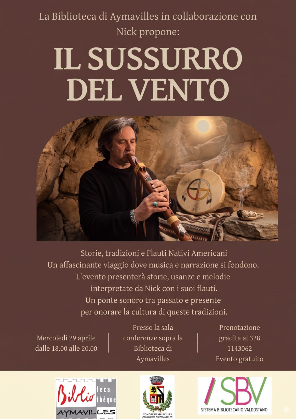 La Biblioteca comunale di Aymavilles organizza per mercoledì 29 aprile 2026 dalle ore 18 alle ore 20, un incontro culturale intitolato Il Sussurro del Vento. L’iniziativa è curata da Domenico “Nick” Iacovelli, ricercatore indipendente ed esploratore sonoro, che propone un percorso focalizzato sulla musica come elemento di raccordo tra diverse culture.