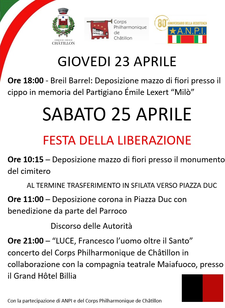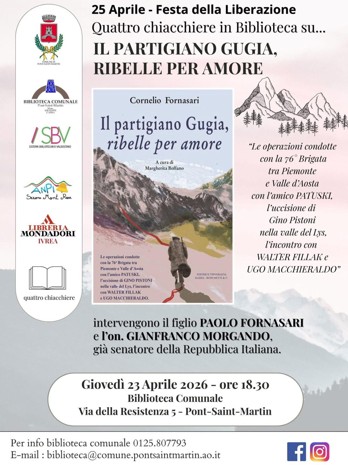 Tra questi si segnalano il laboratorio creativo per colorare i Sassi della Pace, costruire i Papaveri della Memoria e scrivere le Parole al vento sabato 18 aprile alle ore 15 nelle biblioteche di Saint-Marcel, Nus e Fénis, la deposizione di una corona giovedì 23 aprile alle ore 18 a Breil di Châtillon in memoria del partigiano Milò, a Pont-Saint-Martin sempre giovedì alle ore 18.30 la presentazione del volume Il partigiano Gugia – Ribelle per amore sull’esperienza partigiana del giovane eporediese Cornelio Fornasari nelle parole del figlio Piermaria e di Gianfranco Morgando, già senatore della Repubblica.