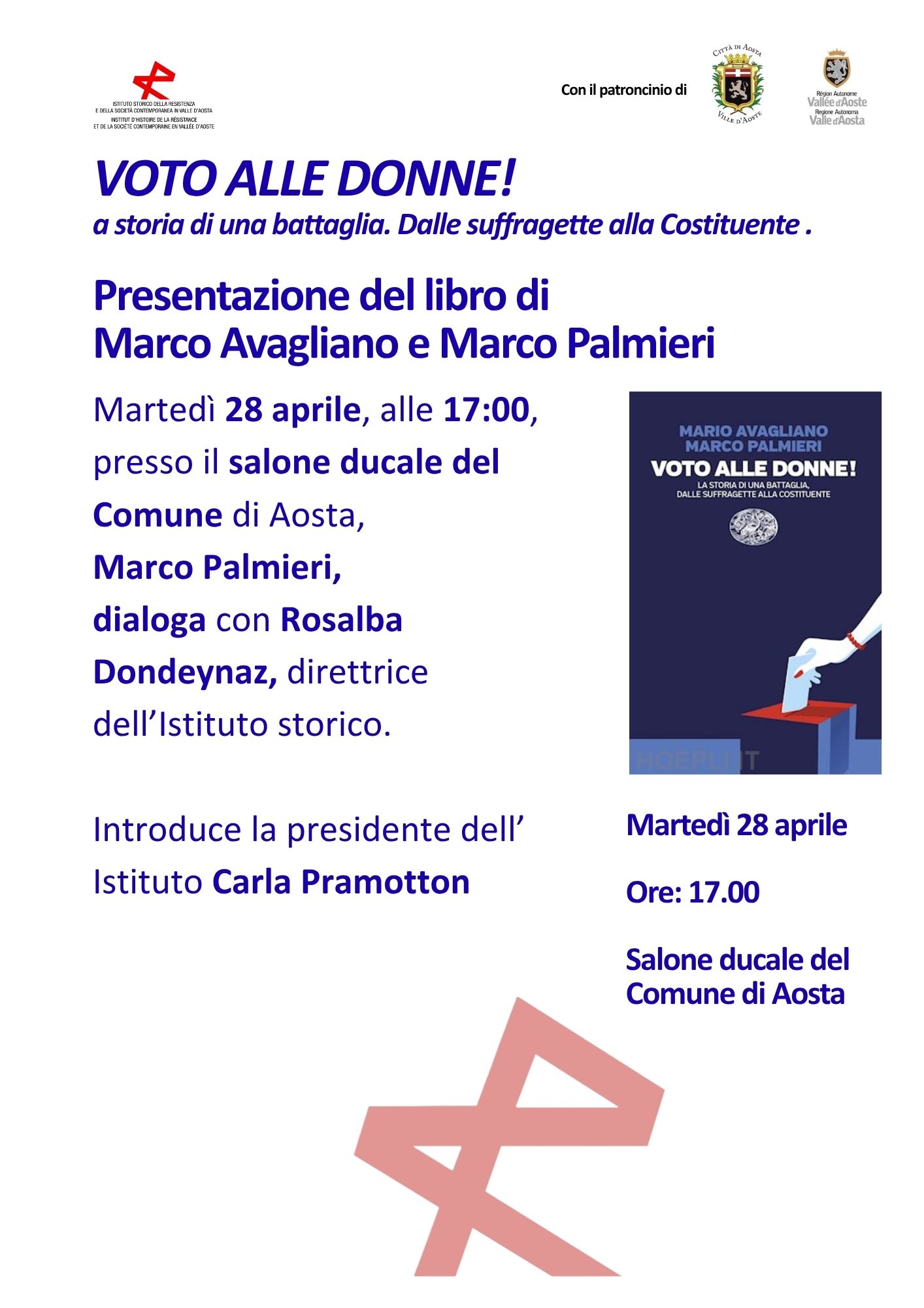 Martedì 28 aprile 2026 alle ore 17, il Salone ducale di Aosta ospiterà la presentazione del libro Voto alle donne! La storia di una battaglia, dalle suffragette alla Costituente di Mario Avagliano e Marco Palmieri, organizzata dall’Istituto Storico della Resistenza e della Società contemporanea in Valle d’Aosta con il patrocinio del Comune di Aosta.