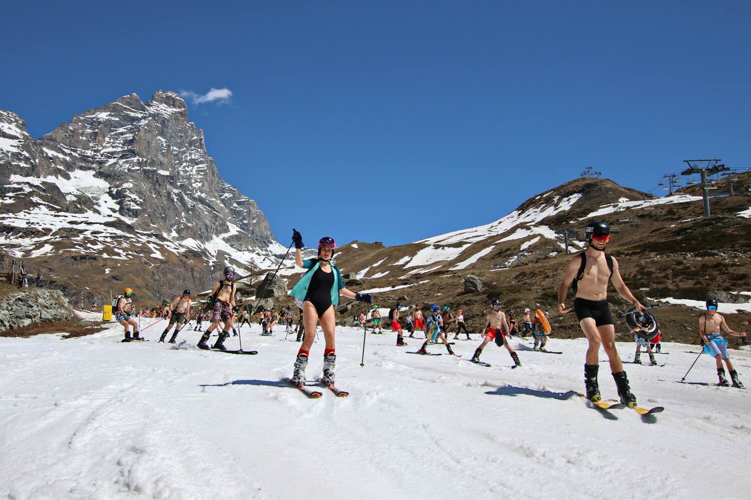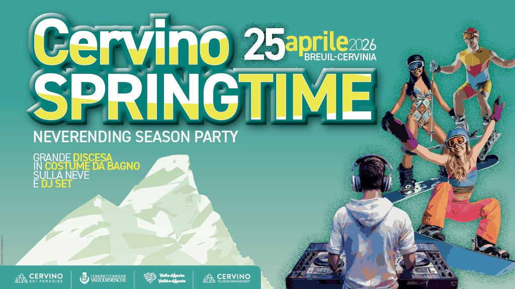 Sabato 25 aprile 2026 le piste di Breuil-Cervinia hanno ospitato la Cervino spring time, appuntamento ormai tradizionale che segna la fine dell’inverno con una discesa goliardica in costume da bagno dai 2.550 metri di Plan Maison fino al villaggio Cretaz. Pantaloncini, bikini, bermuda, accappatoi e accessori balneari abbinati al casco da sci hanno colorato le piste in una giornata di cielo sereno, sole primaverile e temperature elevate anche in quota. Circa 1.200 sciatori e snowboarder hanno risposto all’appuntamento.